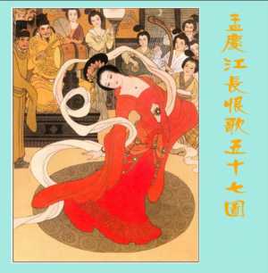 白居易的千古名作《长恨歌》分别被著名连环画家孟庆江先生和戴敦邦先生先后绘制成了彩色连环画。不管是孟庆江先生还是戴敦邦先生的《长恨歌》,都倾注了作者大量的心血与精力,都把李、杨的爱情故事刻画的淋漓尽致,留下了许多令人难忘的精美画面。